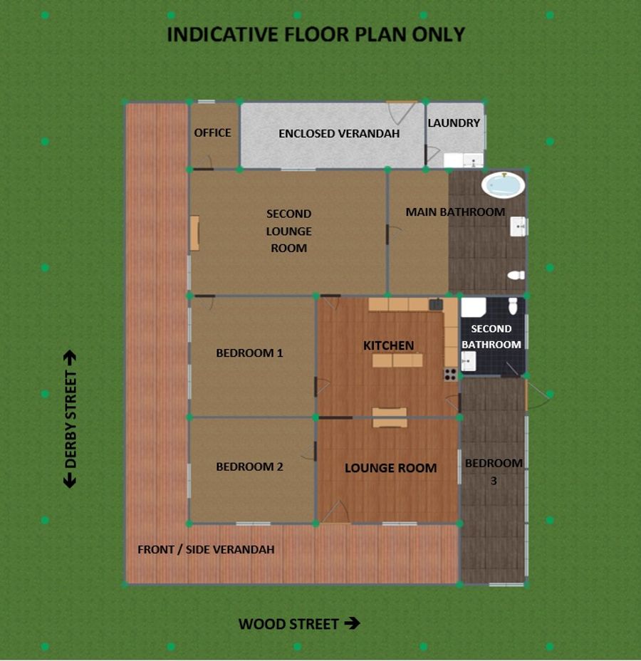 Sitting on a large 1774 m² corner allotment and comprising lounge room, new modern kitchen with built in stainless steel ceramic cooktop and range-hood, spacious island bench with built in drawers, combustion wood heaters in both kitchen and lounge room, all new electrical lighting and fans throughout the house. Three good size bedrooms, main bathroom plus second bathroom with shower bath combo to relax in. New laundry, rear sunken lounge room with adjacent office nook, rear enclosed verandah and front and side verandahs.